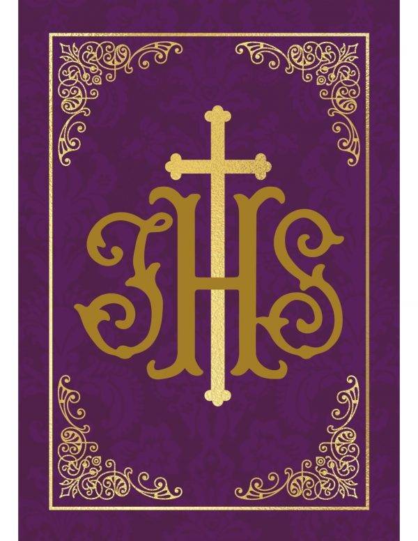 Balconera de fondo color morado con grecas doradas y representación de las siglas JHS en dorado.