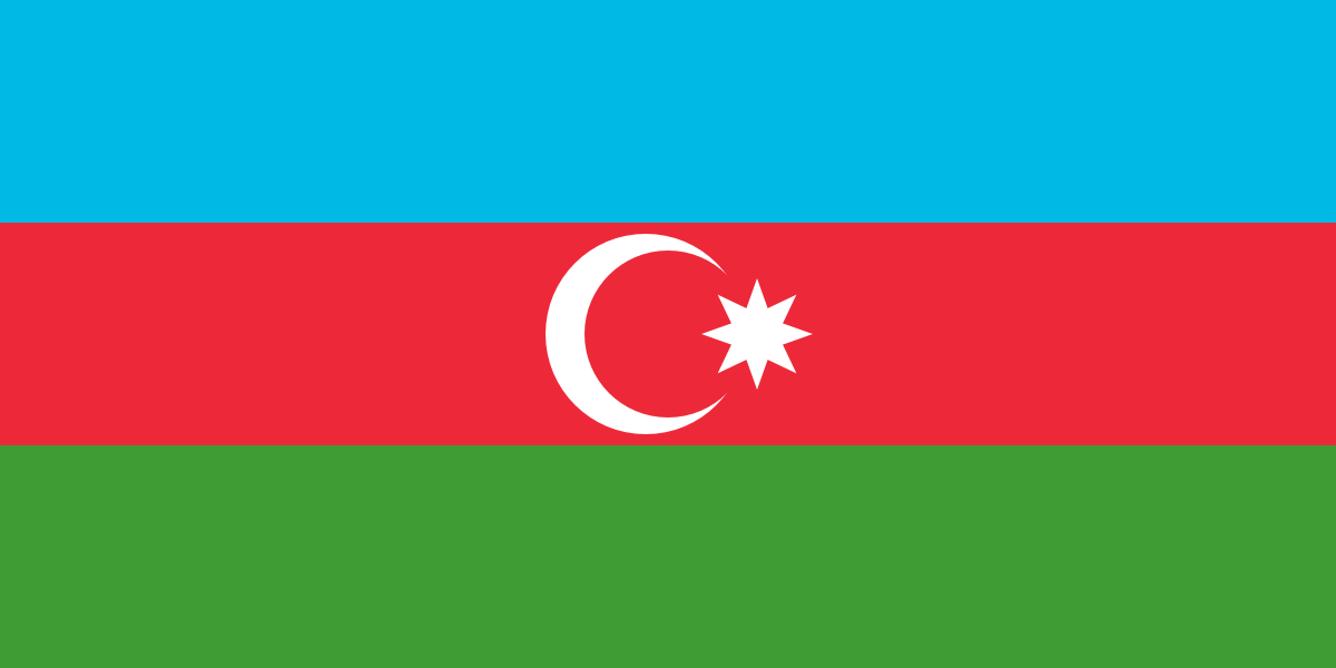 La Bandera de Azerbaiyán, cuenta con tres bandas horizontales iguales de azul, rojo y verde. Una luna creciente y una estrella de ocho puntas, símbolos del Islam, se centran en la banda roja.