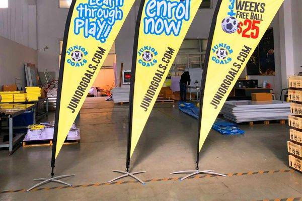El kit completo incluye bandera estampada con mástil, base cruz con contrapeso de H2O y bolsa de transporte.